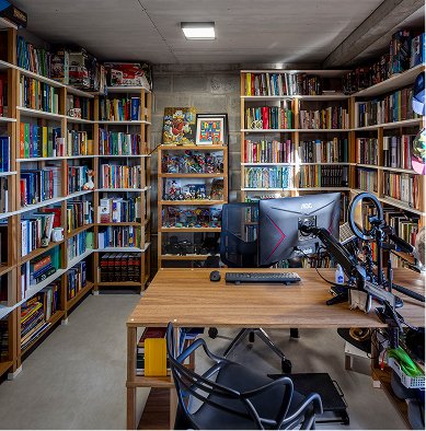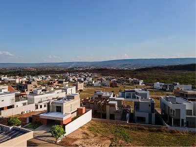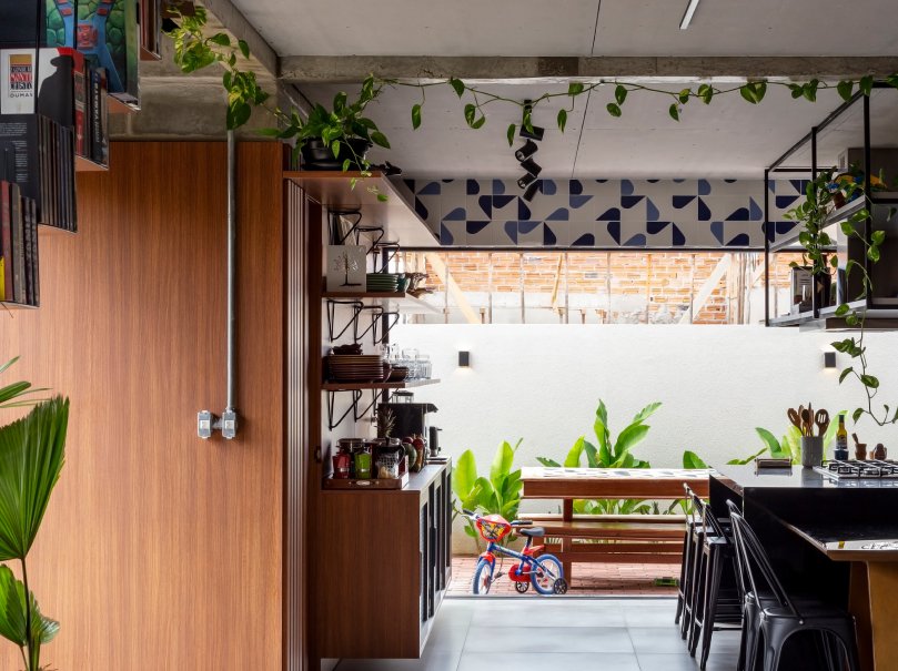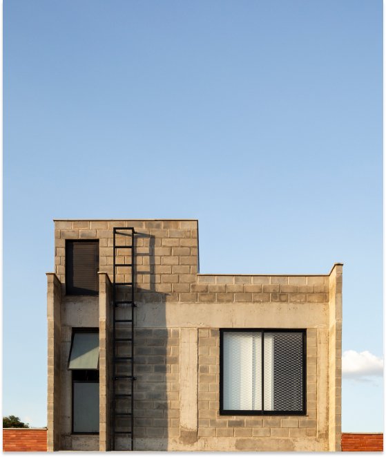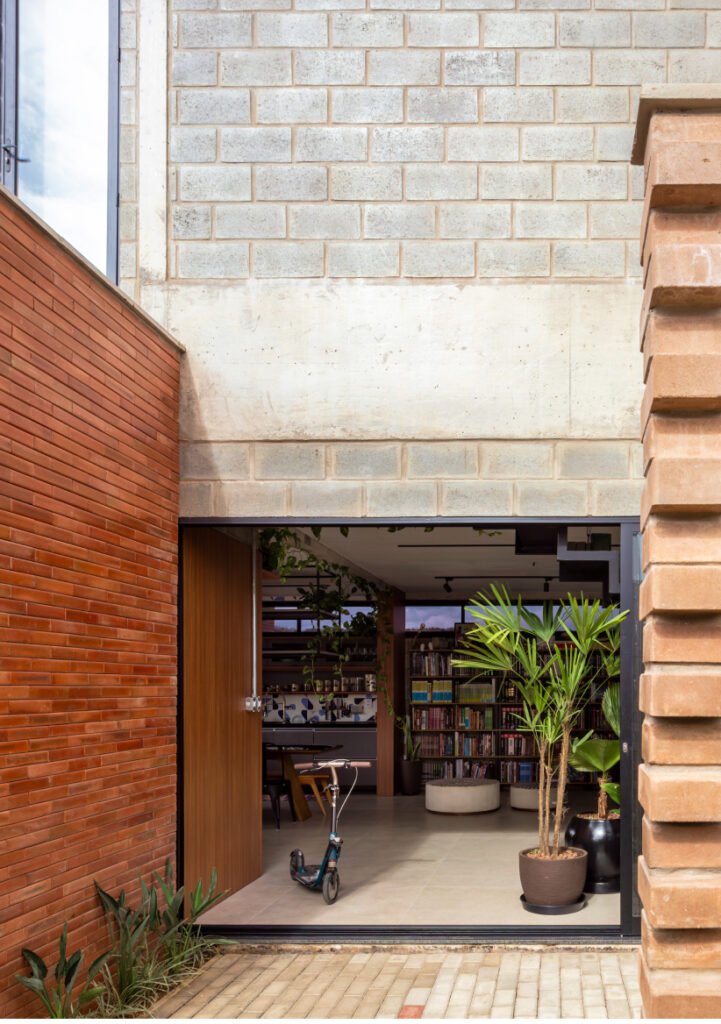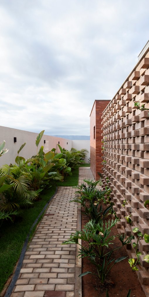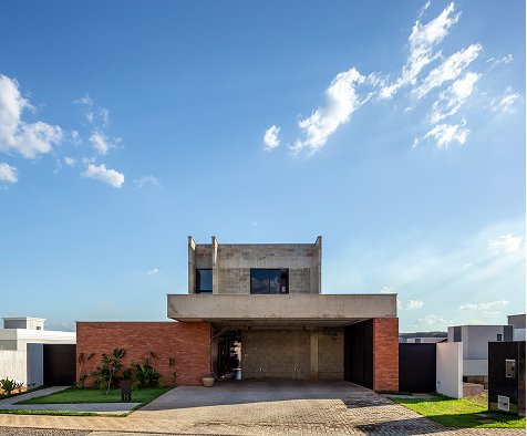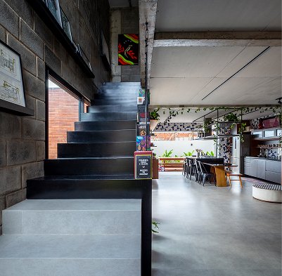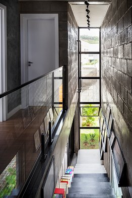 O setor íntimo, por sua vez, fica completamente distribuído no pavimento superior, abrigando três suítes. A casa vão possui uma plástica volumétrica purista. Uma relação concisa entre os blocos e à estrutura, todos em materiais aparentes; o Barros vermelhos das lajotinhas, os blocos de concreto e o cinza das vigas e pilares, afirmam a substancialidade trazida à casa, que transita entre as linhas objetivas do brutalismo e o insdustrial.