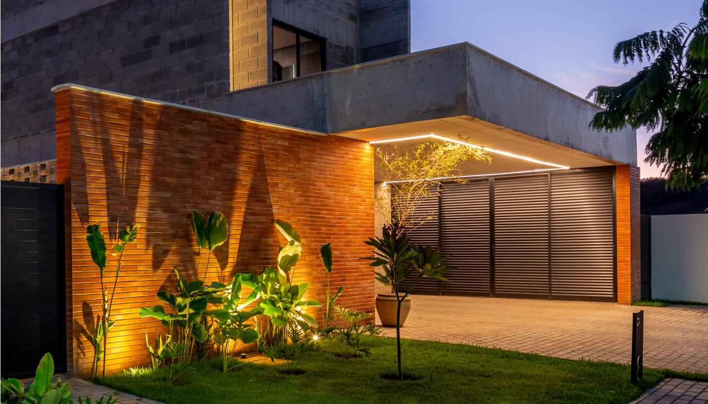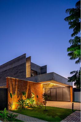 Uma das premissas do programa de necessidades foi a integração do espaços internos com o verde do paisagismo exterior e, ao mesmo tempo, a manutenção da privacidade visual, o que nos direcionou à adoção de algumas fachadas cegas a quem está de fora, porém quando se adentra os espaços, há uma justaposição de aberturas estratégicas afim da priorização dos recursos naturais: ventilação e iluminação.