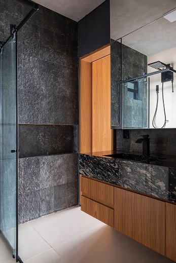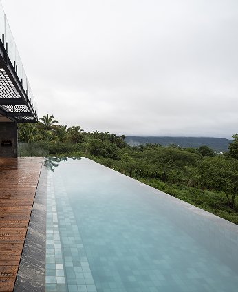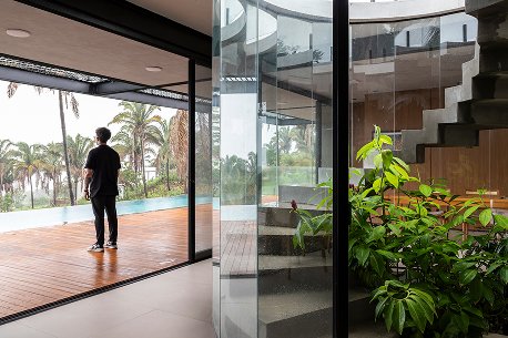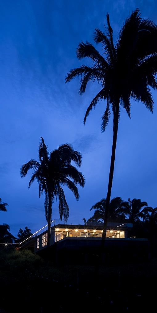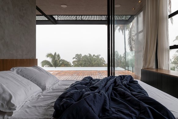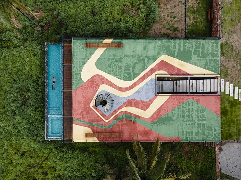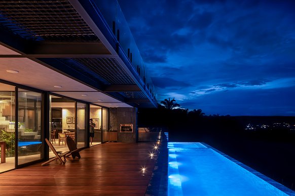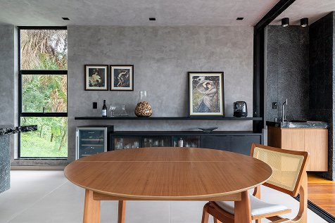 O terreno, por sua vez, com um desnível acentuado, nos levou a uma implantação majoritariamente sobre pilotis, tanto para reduzir o impacto de contato com o solo natural, quanto para para livrar a casa de problemas como infiltrações.