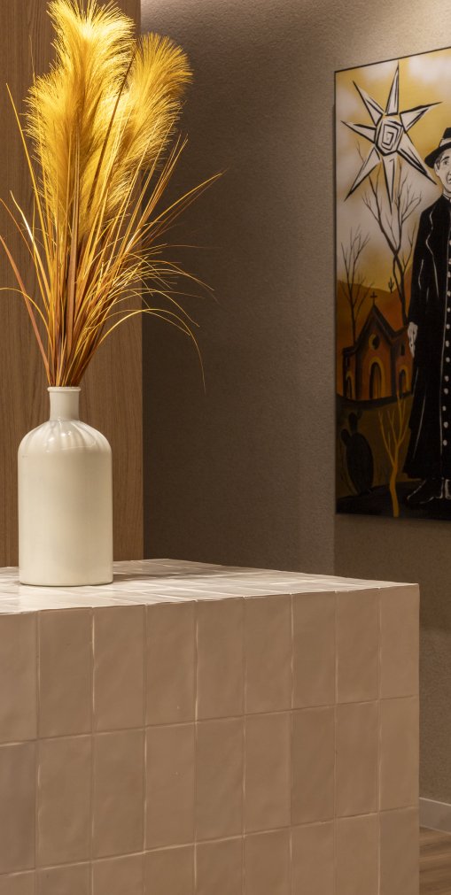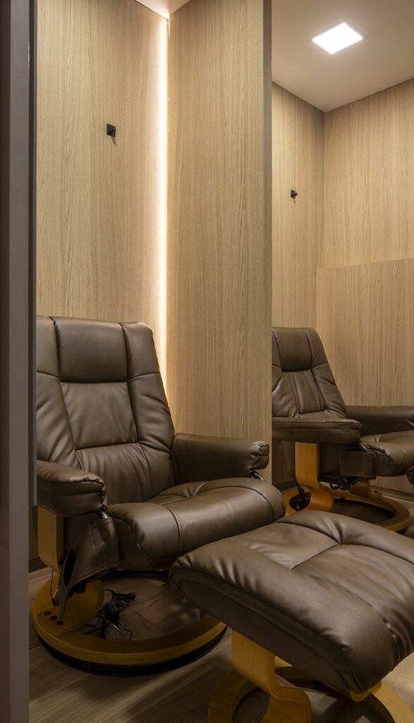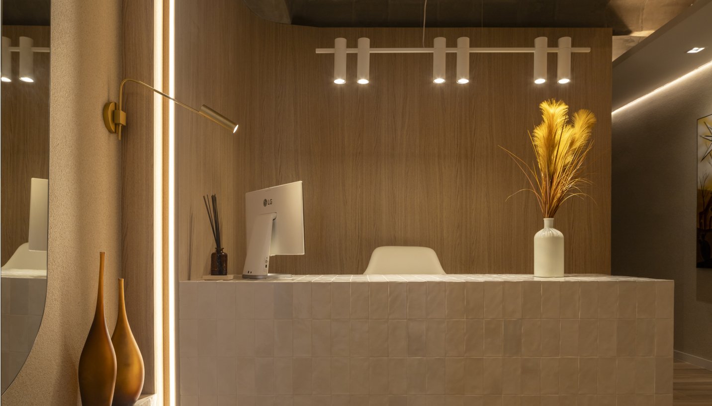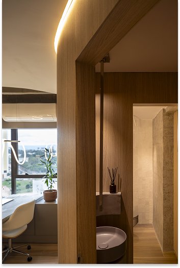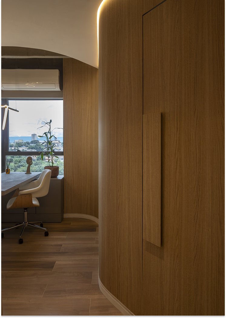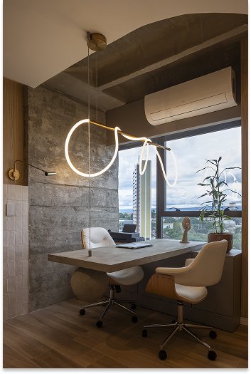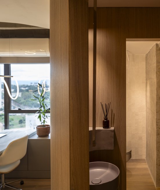 O projeto se desenvolve numa área de 45m², com três salas operacionais, recepção e um lavabo, ambos pensados em suas dimensões mínimas, tendo em vista as limitações espaciais presentes. A finalidade do partido arquitetônico foi tanto estabelecer uma relação flúida na distribuição do programa, através dos vários elementos curvos, como também a adoção de uma materialidade que transmitisse conforto, presente nos tons terrosos e amadeirados, de texturas naturais e aconchegantes, tudo envolto em um diálogo harmônico.