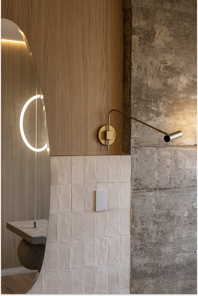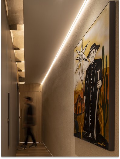 O forro que se sobrepõe à laje, hora esconde as tubulações técnicas e hora evidencia o desenho natural da laje acontecendo numa dança de curvas, que contextualiza também as formas dos longos paineis de madeira que revestem as paredes, numa relação quase poética, à medida que se percorre o interior do espaço.